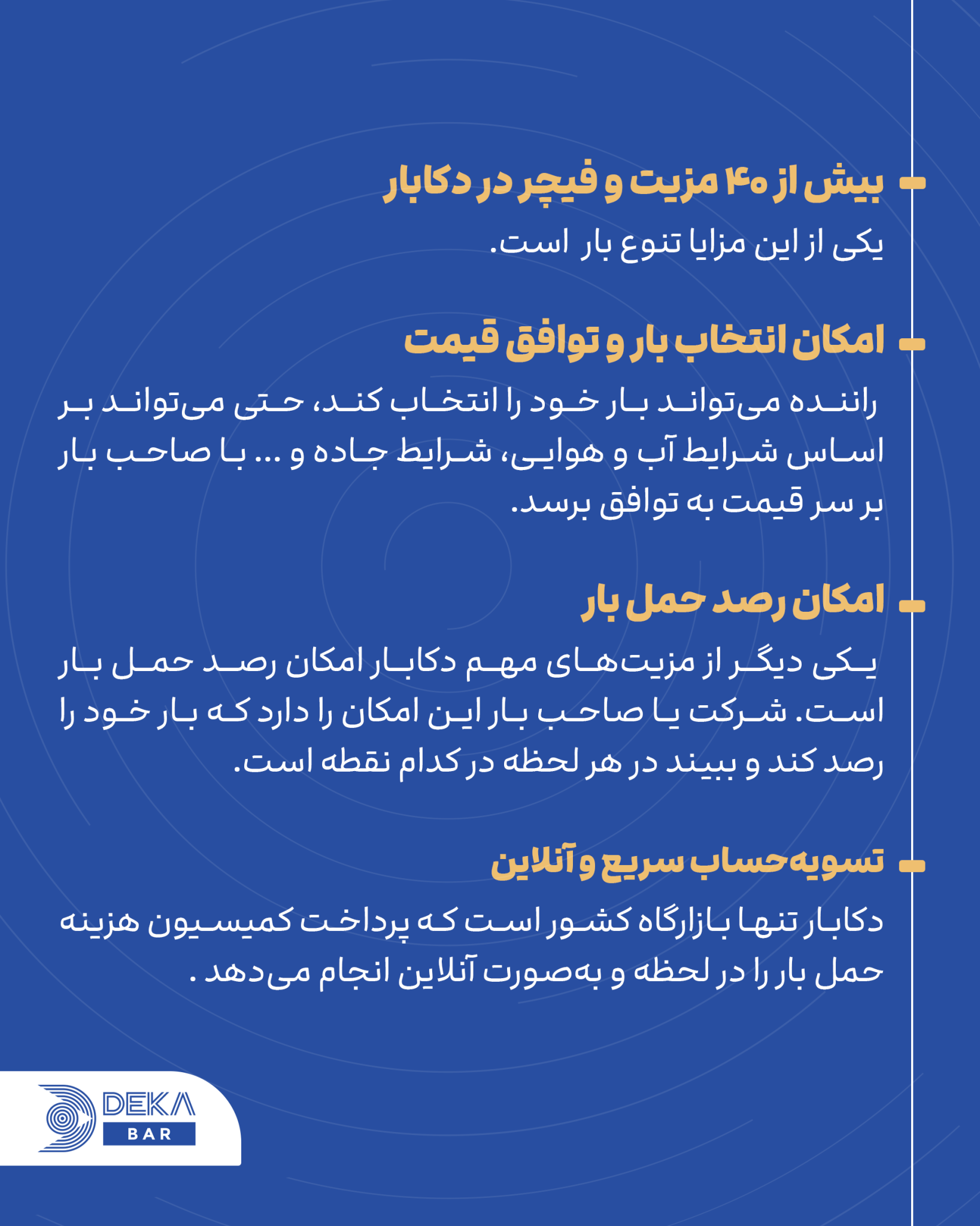 کاوه، درخصوص مزایای رقابتی پلتفرم دکابار اظهار کرد: «در مرحله پیش از طراحی این نرمافزار و در فرایند توسعه، نرمافزارهای موجود در بازار را رصد و بر اساس تحقیقات بازار، بیش از ۴۰ مزیت و فیچر را در دکابار فعال کردیم. یکی از این مزایا تنوع بار در دکابار است. راننده میتواند بار خود را انتخاب کند، حتی میتواند بر اساس شرایط آب و هوایی، شرایط جاده و … با صاحب بار بر سر قیمت به توافق برسد. یکی دیگر از مزیتهای مهم دکابار امکان رصد حمل بار است. شرکت یا صاحب بار این امکان را دارد که بار خود را رصد کند و ببیند در هر لحظه در کدام نقطه است. تسویهحساب سریع و آنلاین یک مزیت مهم دیگر دکابار است. تنها بازارگاه کشور هستیم که پرداخت کمیسیون هزینه حمل بار را در لحظه و بهصورت آنلاین انجام میدهیم. وقتی راننده از شهری برمیگردد، بار شهر مقصد و شهر بعدی را در اپ دکابار انتخاب میکند، چانهزنیها انجام میشود و قیمت مورد توافق قرار میگیرد، راننده کمیسیون را بهصورت آنلاین پرداخت میکند و در نهایت بارنامه بهصورت آنلاین صادر میشود. پس از توسعه و اتصال سیستم تأمین اعتبارِ دکابار به صاحبان بار، دیگر نیاز نیست راننده مدتها برای دریافت هزینه کرایه منتظر بماند.»