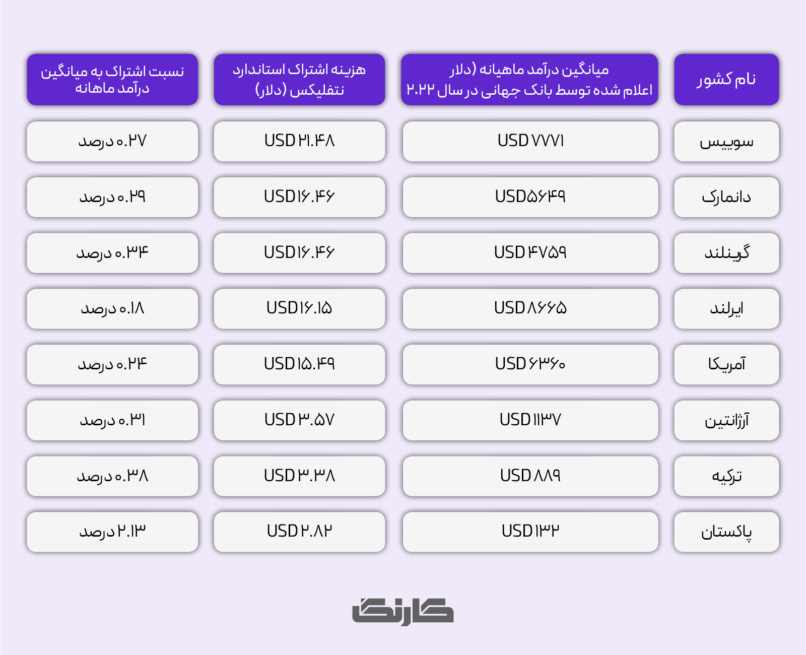 جدول ۱: میانگین درآمد ماهانه افراد در کشورهای مختلف و هزینه‌ای که برای اشتراک نتفلیکس پرداخت می‌کنند