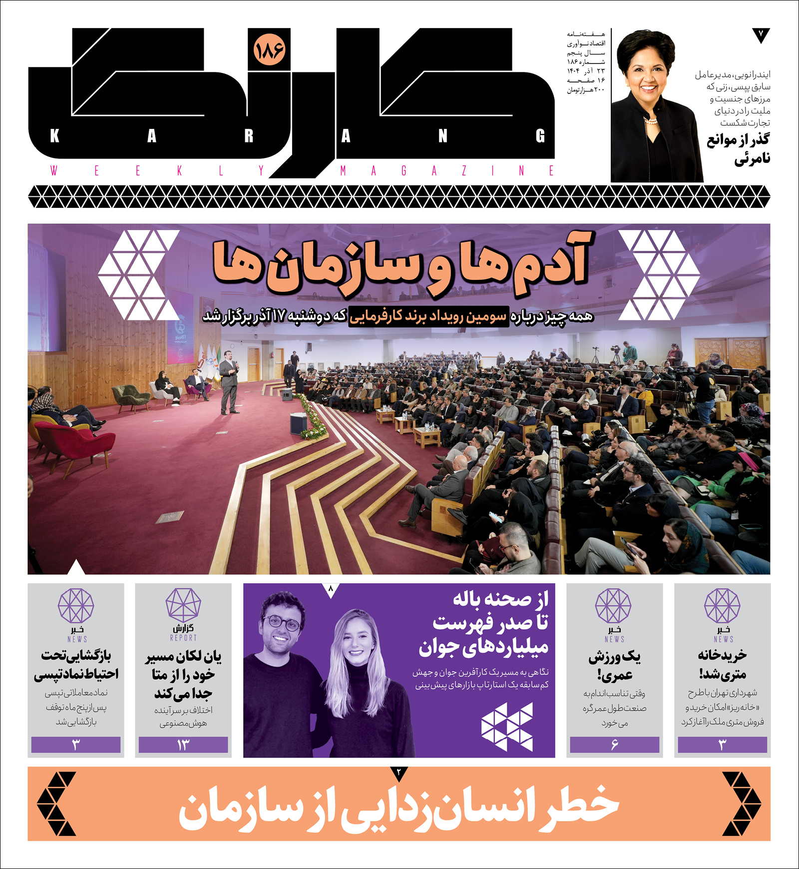 شماره ۱۸۶ هفته‌نامه کارنگ با تصویر روی جلد اختصاص‌یافته به سومین رویداد «برند کارفرمایی» منتشر شد. این رویداد، ۱۷ آذرماه ۱۴۰۴ با حضور بیش از ۶۰۰ نفر از مدیران، فعالان منابع انسانی و فناوری در کتابخانه ملی برگزار شد و سخنرانان درباره نسبت هوش مصنوعی و کار، روایت‌های پنهان سازمانی، نقش قدردانی، هویت برند و ضرورت «مراقبت انسانی» در همه سطوح سازمان سخن گفتند.